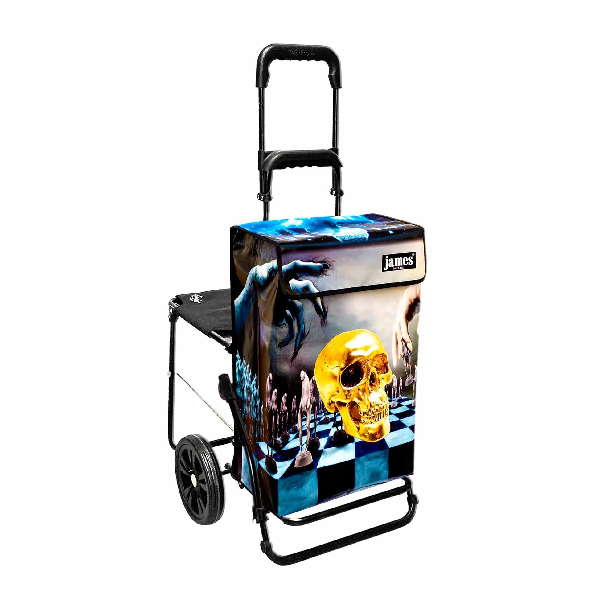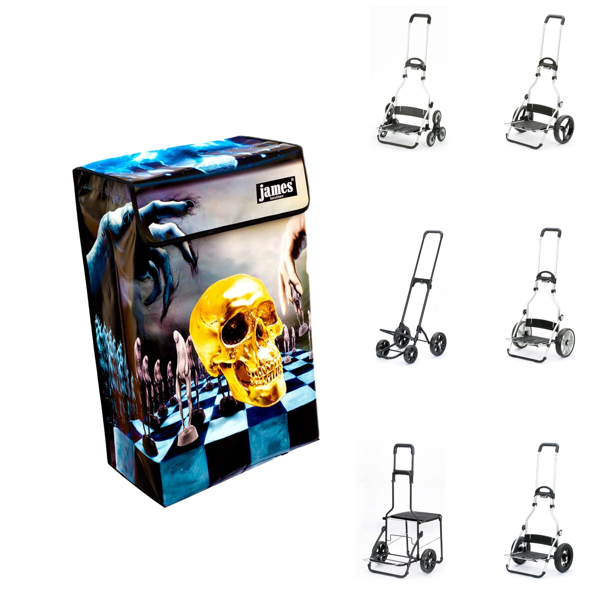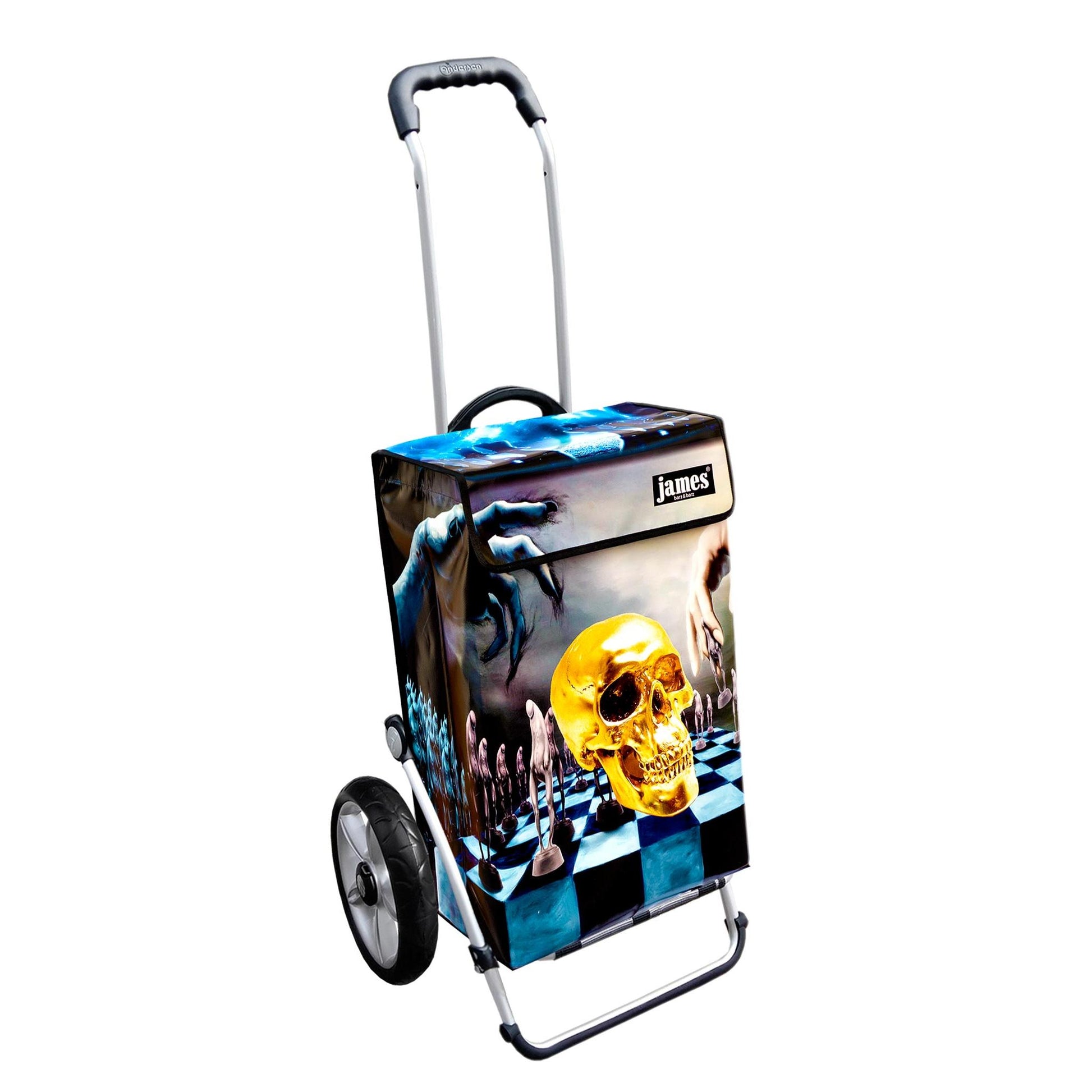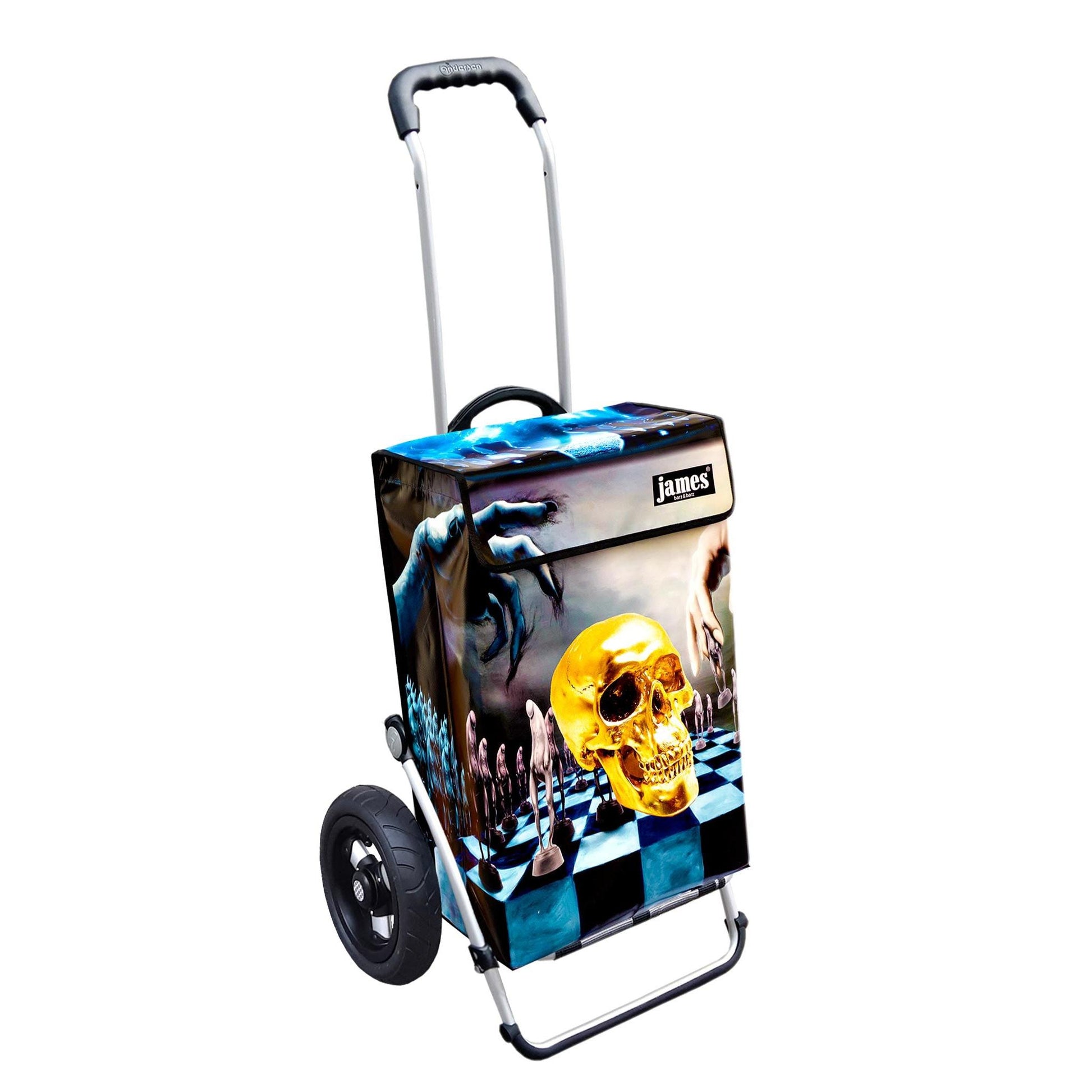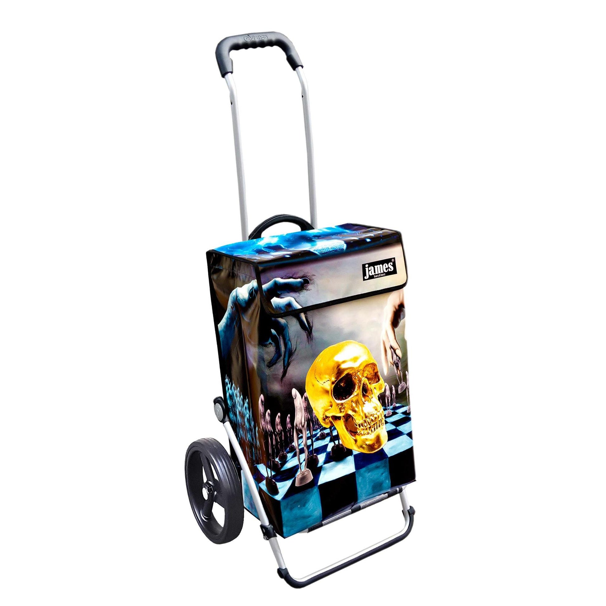 The Hamlet-James is probably the only shopping cart in the world with a skull on it! For Hamlet-esque thinkers and existentialists, chess strategists and black wavers, truly gothic, spooky, punk, and freaky!